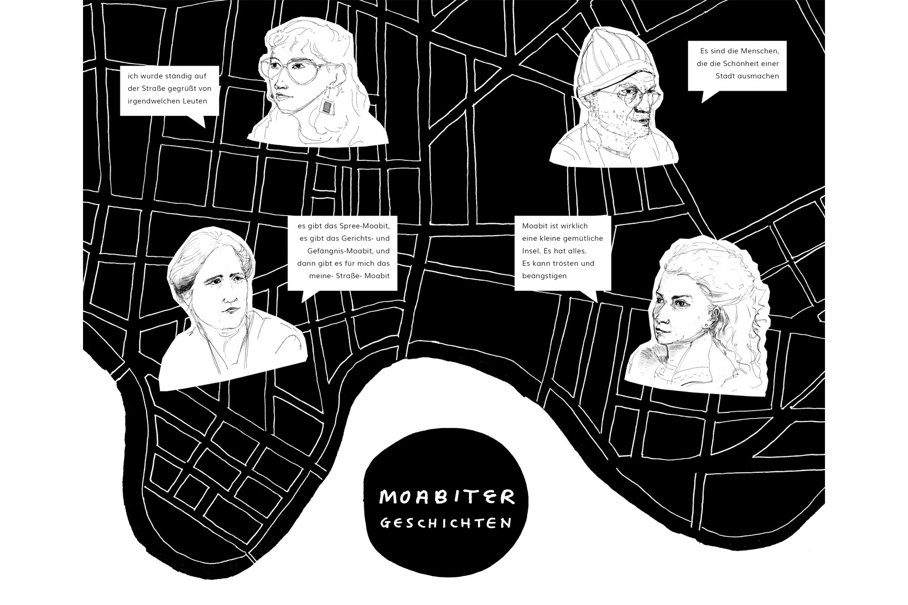 „Moabiter Geschichten“ ist ein künstlerisch-anthropologisches Projekt zur Archivierung von Stadtgeschichten, das im Mai 2017 vom Künstler*innenkollektiv nomadicArt initiiert wurde und seitdem fortläuft. Ziel des Projektes ist es, ein multimediales Archiv von Moabiter Geschichten, Gefühlen und Wahrnehmungen zu generieren, und es durch eine Vielzahl von Formaten, darunter ein digitales Online-Archiv, Postkarten und öffentliche Veranstaltungen zu kommunizieren. Das Kollektiv möchte eine Kultur des Zuhörens, Austausches und der Akzeptanz in heterogenen Nachbarschaften fördern und darüber hinaus physische Räume für Begegnung, Verständnis und Solidarität in der Nachbarschaft zu eröffnen. Im Rahmen der Ausstellung stellt nomadicArt Prozesse und bisherige Ergebnisse des Projektes vor und macht verschiedene Aspekte von nachbarschaftlichen Zusammenleben in einer interaktiven Installation erfahrbar. Interessierte können vor Ort an einem digitalen Forum teilnehmen.