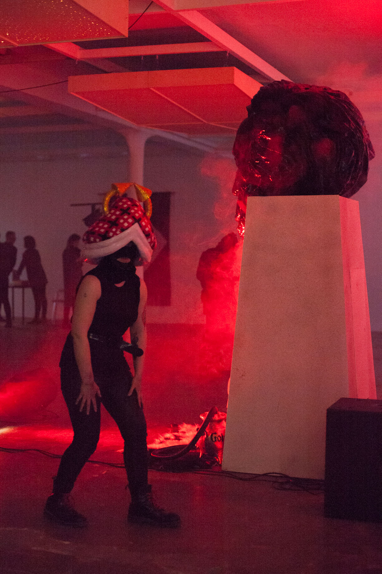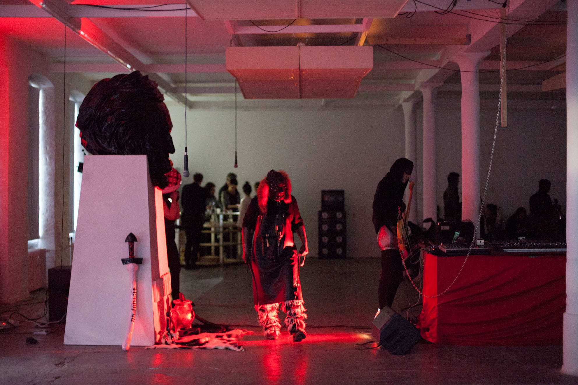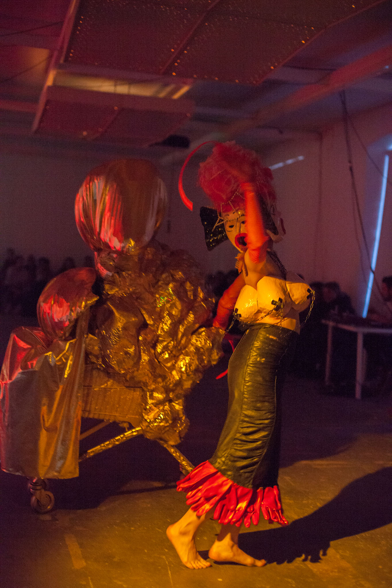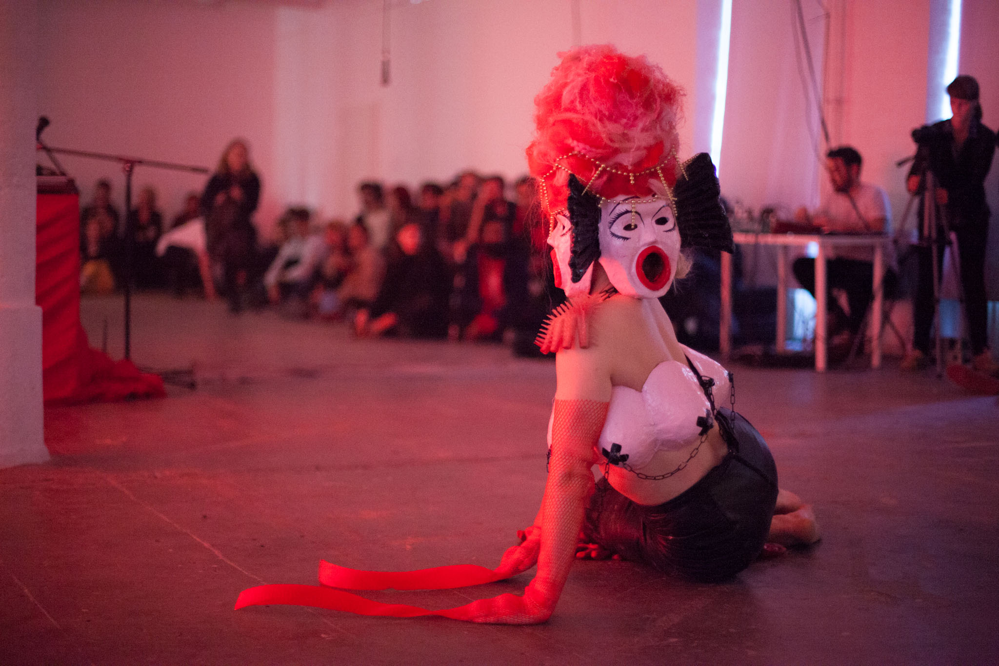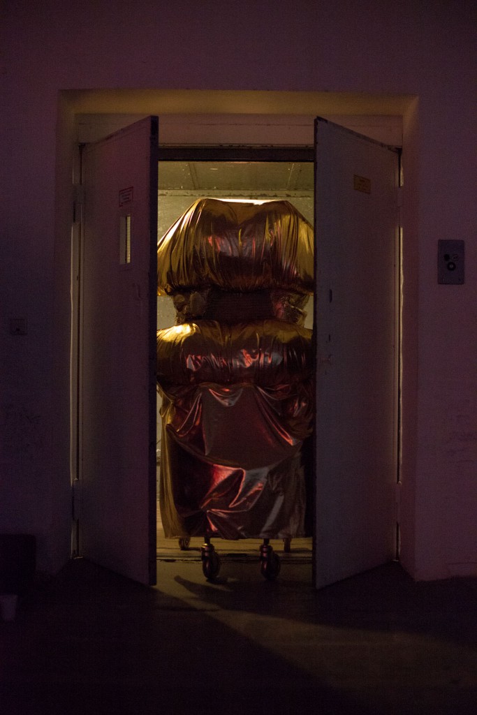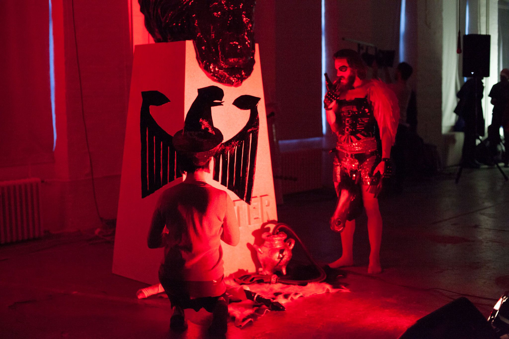 Import Projects presents Aoibheann Greenan’s theatrical and interactive piece ‚The Wagner Rite‘ adapted specially for the April ONS #8. Greenan takes irish writer George Bernard Shaw’s political commentary on Wagner’s tetralogy ‚The Ring of the Nibelungs‘ as her starting point to envision and create an epic drama in which sexual desire is a symptom of cupidity and sexual perversions mirror systems of law and domination. At KW four performers will engage the audience in a pseudo-ritual involving live music, a giant godhead figure, elaborate hand-made costumes and props. In sudden eruptions, the drama will unfold amidst the audience within four ‘zones’. Narrated by giant lips sitting astride a golden shopping trolley the performance will be accompanied by an original musical score, a mix of techno anthems and Wagnerian leitmotivs. At KW Import Projects presents a unique version of Greenan’s full operetta, which will be staged in its entirety as ‘The Perfect Wagner Rite’ at their location in Keithstrasse 10 on April 23 and April 30, 2016.