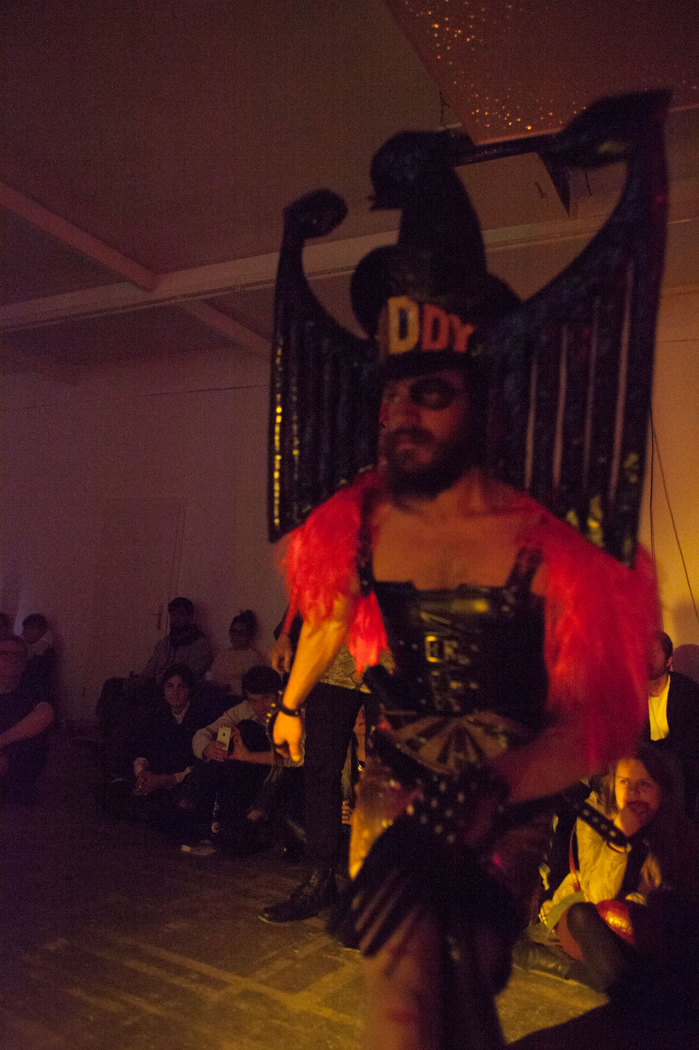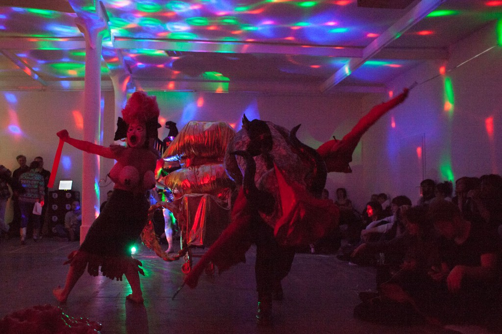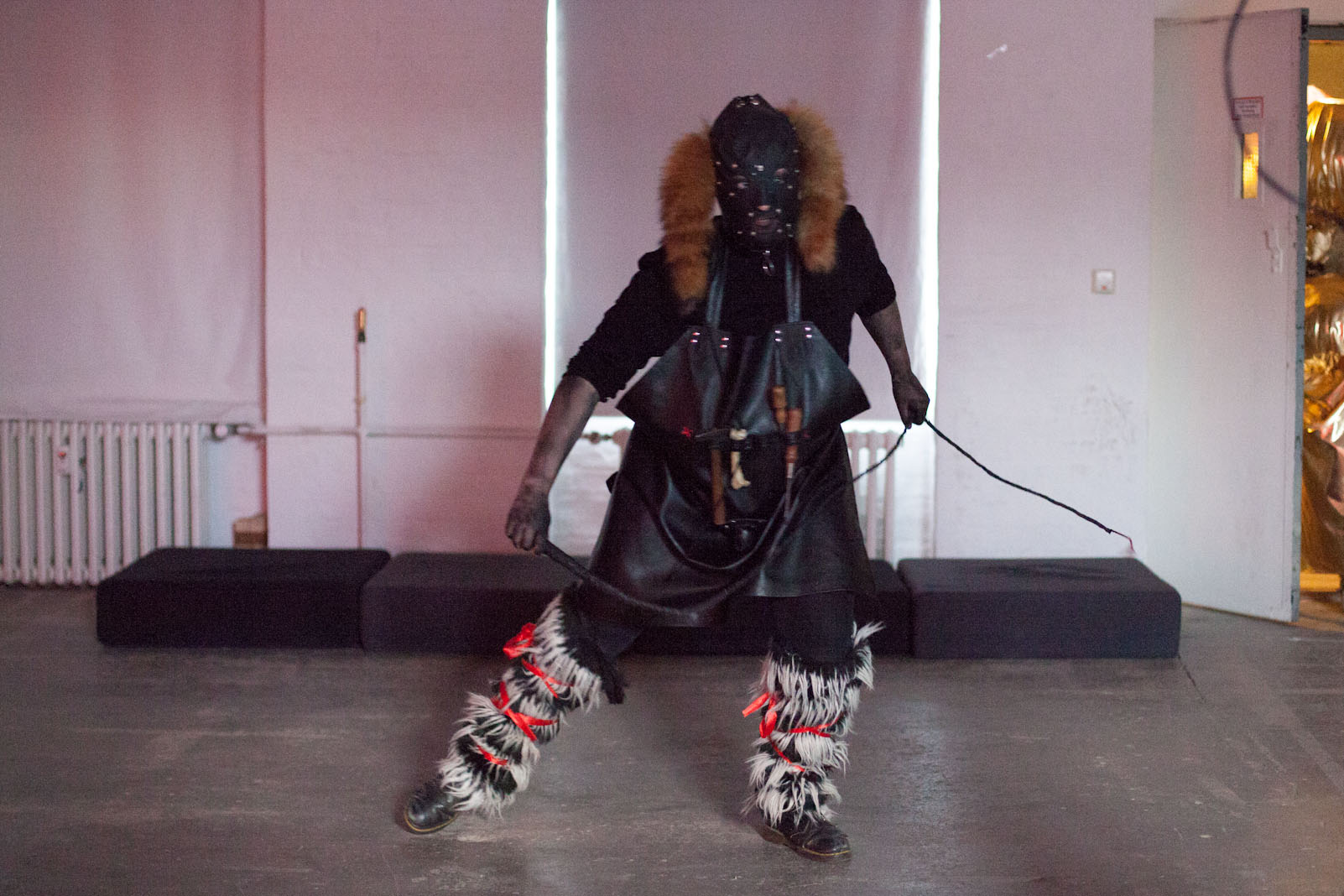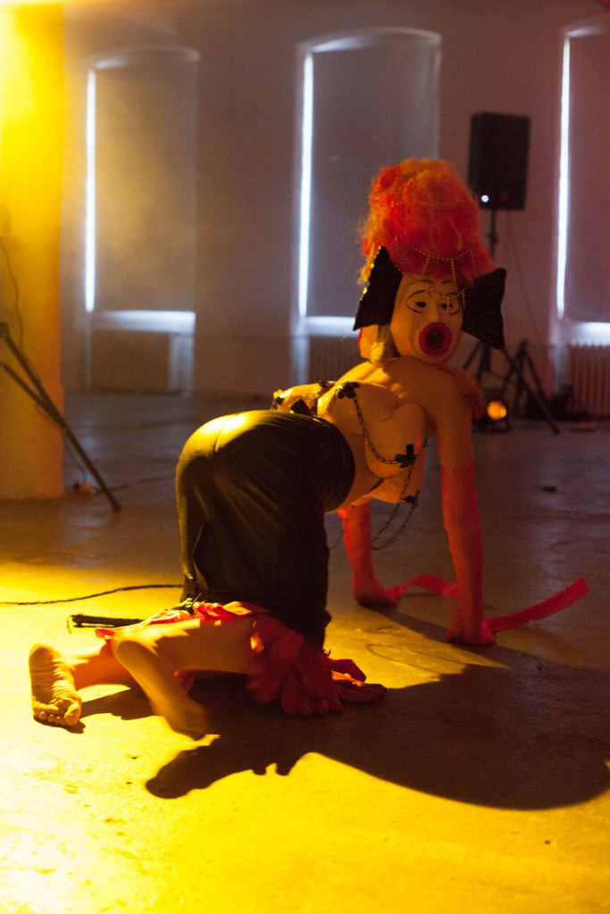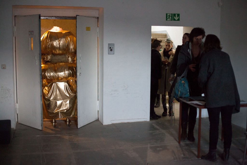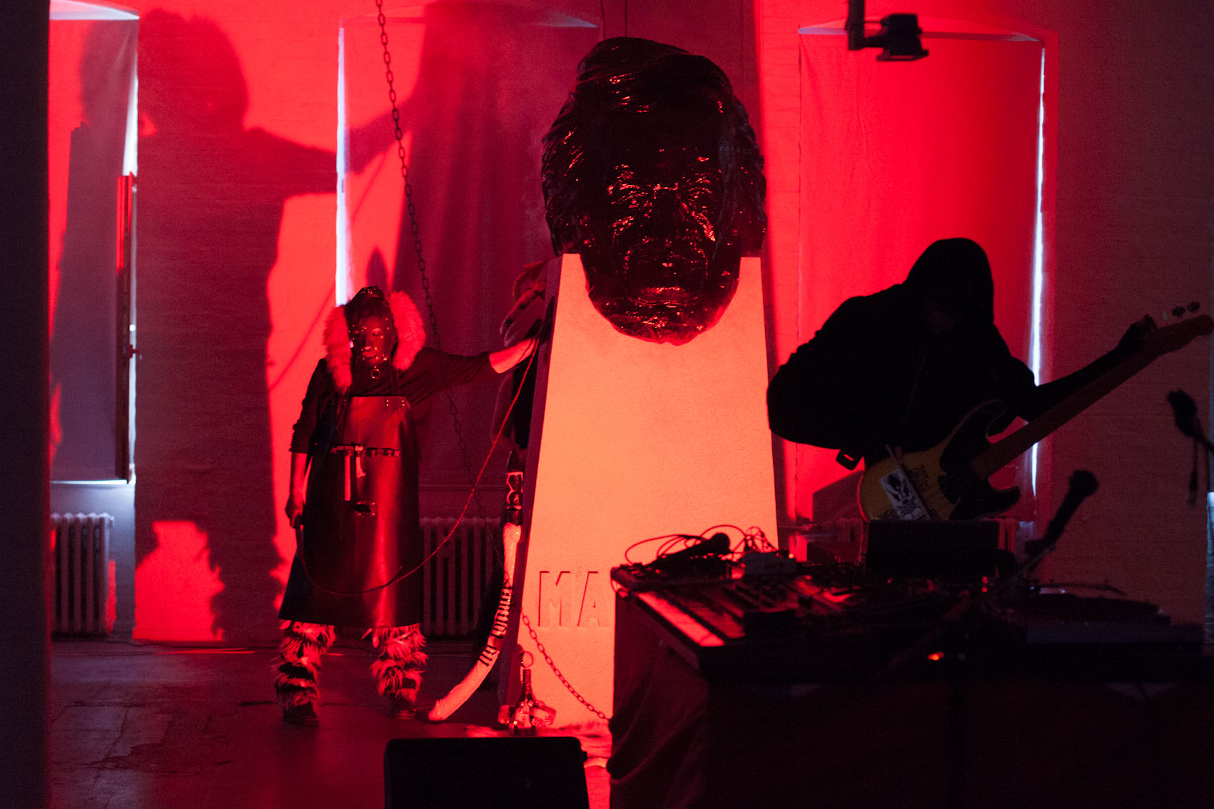 Import Projects presents Aoibheann Greenan’s theatrical and interactive piece ‚The Wagner Rite‘ adapted specially for the April ONS #8. Greenan takes irish writer George Bernard Shaw’s political commentary on Wagner’s tetralogy ‚The Ring of the Nibelungs‘ as her starting point to envision and create an epic drama in which sexual desire is a symptom of cupidity and sexual perversions mirror systems of law and domination. At KW four performers will engage the audience in a pseudo-ritual involving live music, a giant godhead figure, elaborate hand-made costumes and props. In sudden eruptions, the drama will unfold amidst the audience within four ‘zones’. Narrated by giant lips sitting astride a golden shopping trolley the performance will be accompanied by an original musical score, a mix of techno anthems and Wagnerian leitmotivs. At KW Import Projects presents a unique version of Greenan’s full operetta, which will be staged in its entirety as ‘The Perfect Wagner Rite’ at their location in Keithstrasse 10 on April 23 and April 30, 2016.