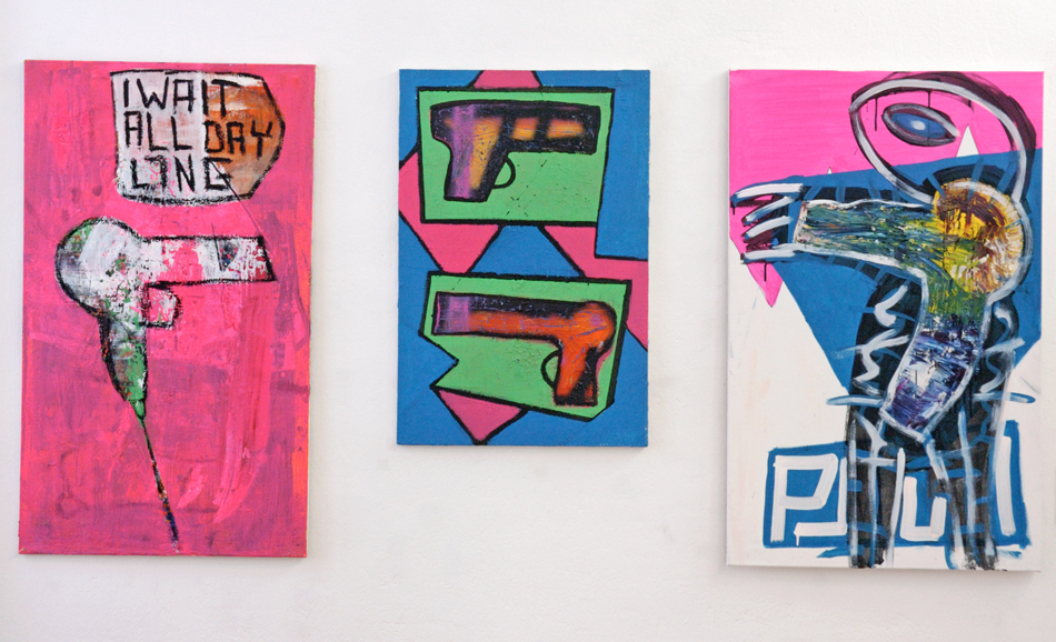 The three paintings are an excerpt from the 9-part series „Elektrogegenständliches – Föhn“. This study deals with the everyday object hair dryer in a painterly dirty expression in the spirit of the art movement Pop Art. In art historical terms, Pop Art is considered a departure from abstract expressionism. In this art series Orthuber unites the two opposing art movements.